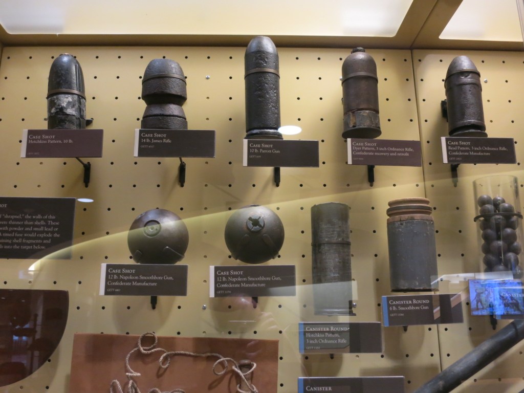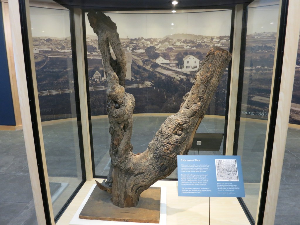 Ein altes Stück Baum, in dem noch Munitionsreste stecken.Ein Teil des verwendeten Waffenarsenals.Ein Teil des Gettysburg Cyclorama (Rundgemälde mit audiovisueller Präsentation).