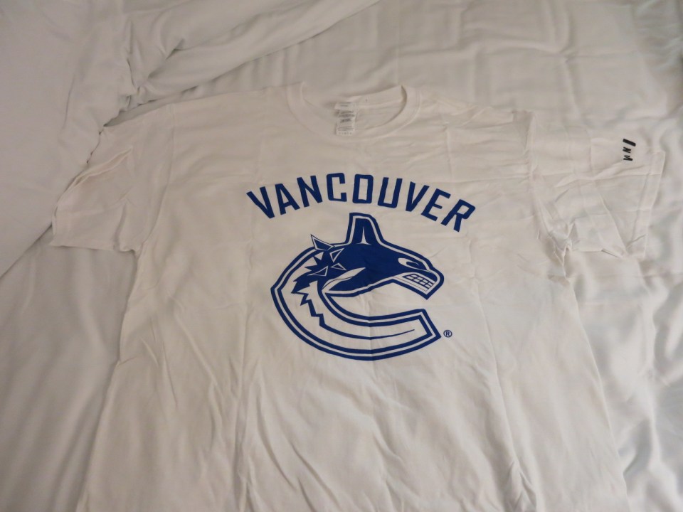 In der Pause zwischen 2. und 3. Drittel wurden wie üblich T-Shirts in die Menge gefeuert. Alle außer mir wollten eines haben – und mir knallt es natürlich an die Birne 😳